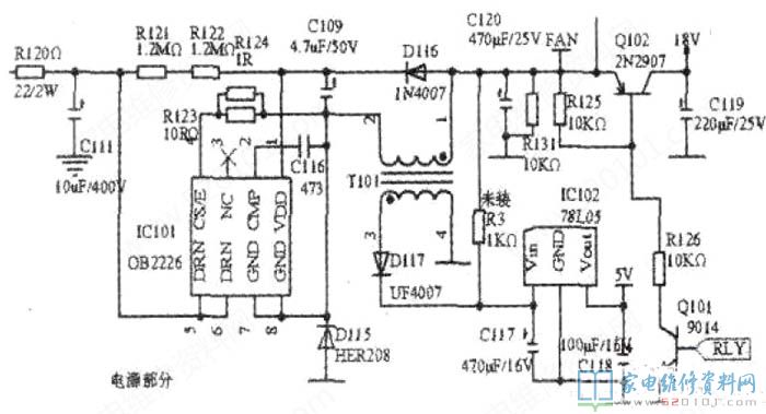 通电后,300V直流电压加在C111两端,同肘经R121、R122提供启动电流加到IC101①脚,IClol导通,电流流经IC101⑤一④脚、R123、Tl01②~①脚,对C120充电。电容C116决定IC101的导通时间(通电瞬间,C116充电,方向为右正左负),充电电流维持IC101⑤。④脚的导通;C116充满电后进入放电状态,IC101⑤。④脚之间截止。当IC101导通时,T101初级线圈存储的感应电势为②脚正,①脚负,D115、D116、D117均截止。当IC101截止时,T101初级线圈的感应电势反相为②脚负,①脚正.D115、D116、D117均导通。续流二极管D115的导通,为T101初级线圈的感应电势提供了释放通道.C120两端形成19V电压:D117的导通,使C117两端形成12V电压,经IC102输出5v稳定电压;D116的导通,使C109两端形成18V电压,为fC101提供工作电压。C116的反复充电与放电,使IC101周而复始地导通与截正,电源进入稳定工作状态。当触摸电磁炉开机键时,Q101得到开机信号导通,Q102亦随之导通,整机得到18V工作电压。