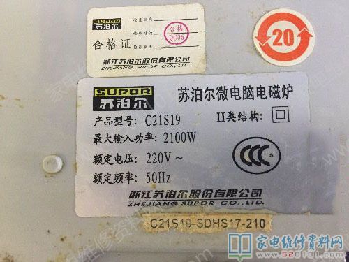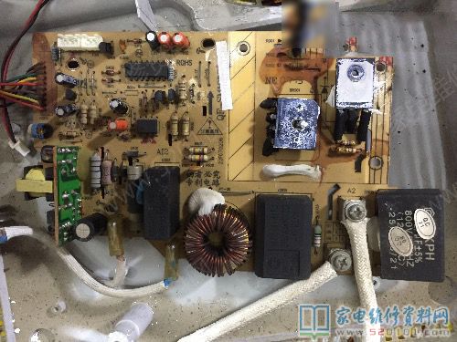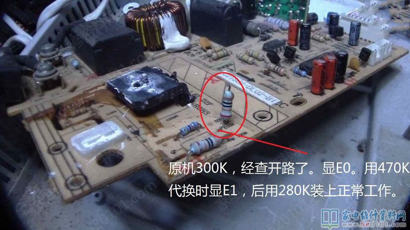 接修一台苏泊尔C21S19电磁炉,故障表现为一开机启动就显示E0代码,首先换了8550,但是故障依旧,最后查出是下图中的电阻开路导致的,原机300K,由于开路导致显示E0,由于手头上没有300K电阻,于是用470K代换后,试机显示E1,后来用280K电阻装上去之后故障修复,一切正常。