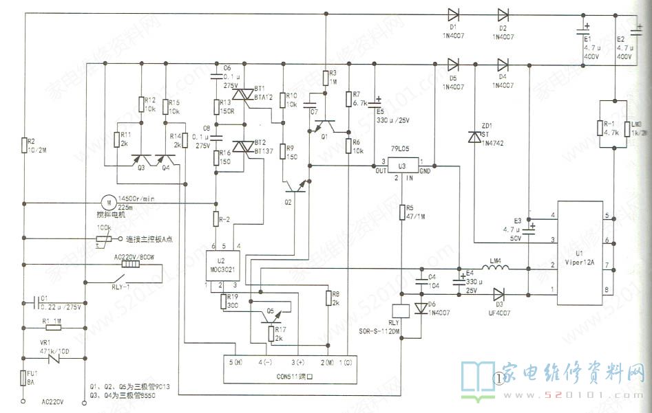 该机电源板实绘电路如图1所示,开关S和电源插座都安装在底座上,当杯体放上底座并且对正位置旋紧上面盖子后,s被压通;提起杯体则断电。压敏电阻VR1、电阻R1和电容C1起滤除浪涌电压作用。AC220V 分成两路,一路给搅拌电机M、电热管L供电;另一路经D1、D2半波整流和E1、E2滤波后得+300V的直流电压,供给U1(VIPER12A)的⑤-⑧脚(芯片内部场效应管漏极)。u1③脚为电压反馈端,与外接zD1(12V)稳压管形成稳压电路。u1④脚为芯片供电端(也与芯片内部漏极高压电流源相连),得电后芯片启动工作,U1的①、②脚接芯片内部场效应管源极,与电容E4、电感LM4和快速恢复二极管D3及U1④⑧脚内部电路组成串联降压(BUCK)电路,三端稳压块U3(79L05 )③脚(OUT)输出-5V 电压,送给主控板供电插座CON④脚(- );U3①脚(GND )作为后级主控板供电的正极,接coN③脚(+),即CON③、④脚电压为+5V。