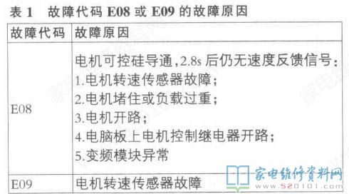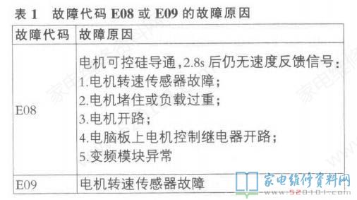 故障现象1:显示故障代码E08或E09,分析检修:显示故障代码E08或E09的故障原因见表1所示。