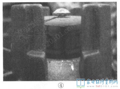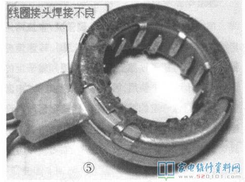 故障现象2:空转能脱水,负载不能脱水,或 在脱水中电机突然加速。 分析检修:首先检查电机是否正常,然后检查 转速传感器线圈电阻是否正常,最后检查传感器 的磁环制钉,如图4所示,如有松动现象,应进行 加固处理,接着检查转速传感器的线圈接头是否 接触良好,如图5所示。