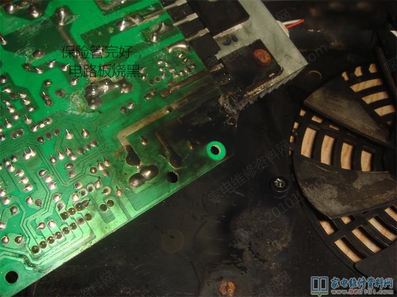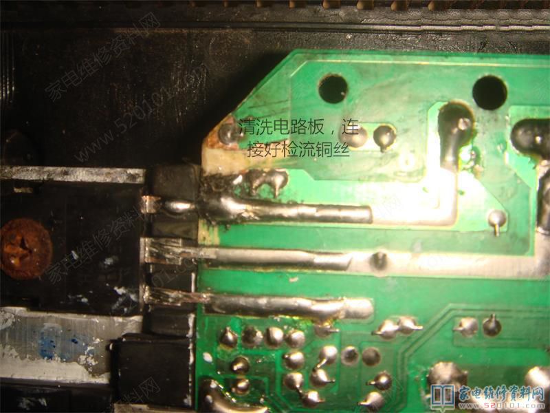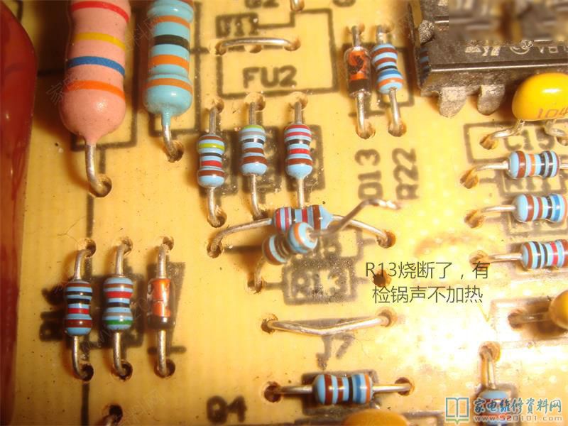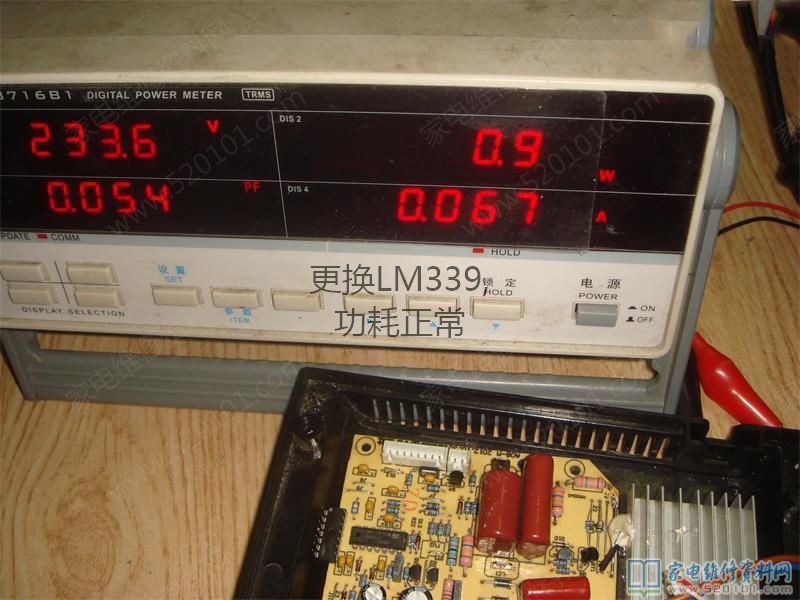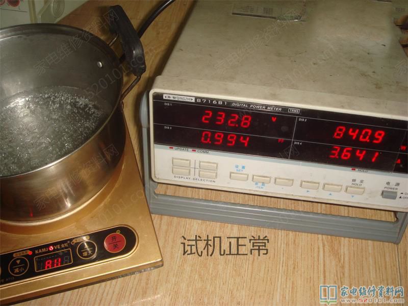 连接好检流铜丝,给大板单独通电,用电参数测量仪监测功耗,高达16.8W,显然不正常。拆掉LM339再通电,功耗为0.7W。换一片LM339,功耗0.9W,5V和18V电压正常。检测功率管驱动端电压正常。连接好线圈试机,有检锅声不加热。凭经验找到检流铜丝连接LM339那只电阻,编号R13,3.6K欧,显然已损坏。找到一只3.3K欧的电阻换上,试机正常。