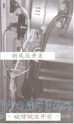 JSQ24-B型家用燃气热水器,开机后面板显示“E5”,蜂鸣器并发出“嘀嘀”声,不烧水。查看该机箱体外贴的故障代码表,“E5”显示风机开关有故障。于是断电,拆下热水器的面板,如图1所示。更换风压开关后开机,故障排除。