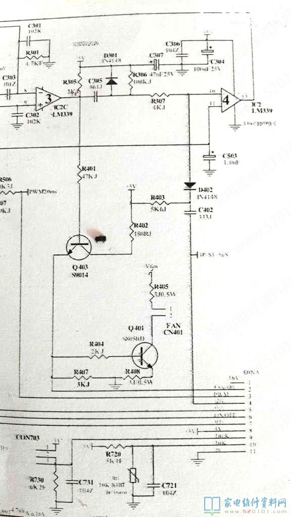 经分析,由于是贴片元件,相对难于下手,经查发现LM339第14脚与MCU检锅/电机电路间一9014贴片三极管失效。此为同步及PAN电路故障引起。从废板拆下换上,故障解决,正常加热。