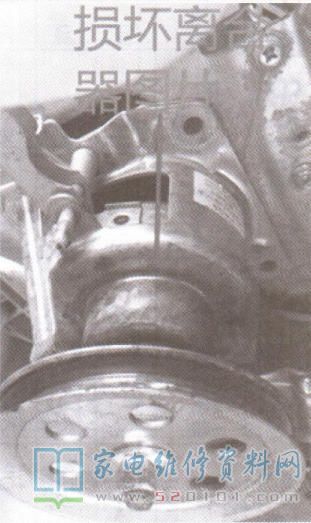 接修一台长虹XQB82-1802型全自动洗衣机,洗涤脱水时噪音非常大。上电试机,洗衣机底部发出铁磨铁的声音。根据维修经验判断,故障原因应是离合器损坏。排水断电,拆开洗衣机后盖,并取下底部的防鼠盖,,目测观察离合器接头部位漏水,如图1所示。正常的离合器是不漏水的,由此确认原离合器已损坏。于是把洗衣机摆正,用螺丝刀卸下波轮固定螺丝并取下波轮。用38mm专用扳手卸下离合器上的法兰固定的大螺母,于是让机器再次放倒,用14mm的扳手卸下离合器上的四角固定螺丝并取出离合器,拿一原厂离合器给更换后,上电试机,故障排除。