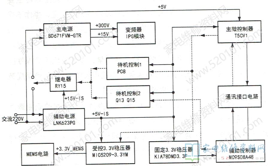 如图3(上半部分)所示,待机控制电路由Q13、Q15、隔离管D3和光耦合器PC8两部分组成,驱动管TR5、TR7、RY15为待机电路共用电路。通电后,辅助电源IC3和稳压器IC7工作,辅助微控制器MC9S08A48获得3.3V工作电压,此时被按“启动"键,MC9S08A48输出控制From-SUB -Relay一Watchdog信号,Q13.Q15及D3相继导通,RT5、RT7随之导通,RY15经限流电阻R241、R242得电吸合,主电源电路得电开始工作。主电源工作后,不但为变频器电路(IPG模块)提供工作电源,还产生5V电压为主微控制器T5CV1供电,T5CV1输出MAIN-Watch-DOG控制电压使光耦PC8、TR5、TR7导通,RY15处于吸合状态,直至按“关机"键使MAIN-Watch-DOG信号消失,RY15释放信号切断主电源供电。T5CV1工作后,还同时输出MEMS-Power- ON/OFF信号使IC5工作,MEMS电路获得3.3V工作电压。主微控制器工作后,通过通讯接口使辅微控制器停止信号输出,Q13.Q15.D3截止,完成一次 启动控制过程。