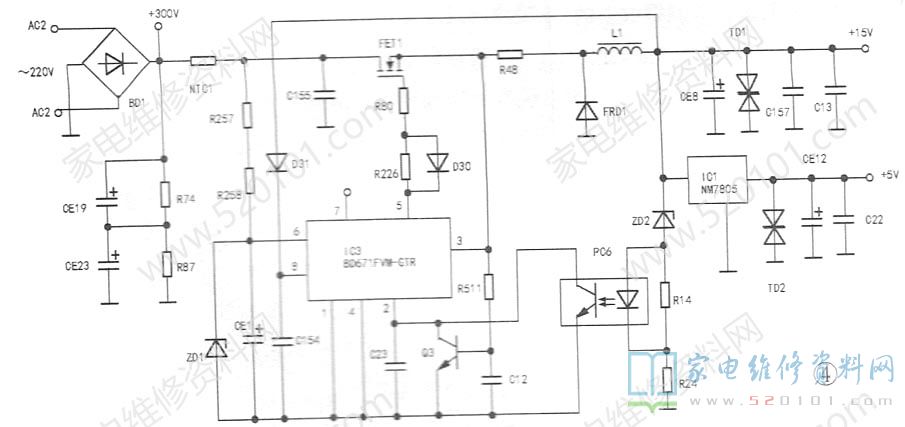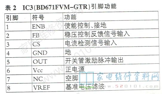如图4所示,以电源控制型电源芯片IC3(BD67IFVM- GTR)为核心,FETI为大功率场效应开关管.R257.R258.CE1组成充电式启动电路,稳压管ZD1为过压(24V)保护管,C23为软启动电容。ZD2.R14.R24.PC6组成稳压控制电路,R48为电流取样电阻,和R511.C12.Q3等组成过流保护电路。储能电感,CE8为充放电(兼滤波)电容。主电源产生的300V、15V电压为变频器供电,5V电压作电源芯片IC3的工作电源,IC3各引脚功能如表2所示。