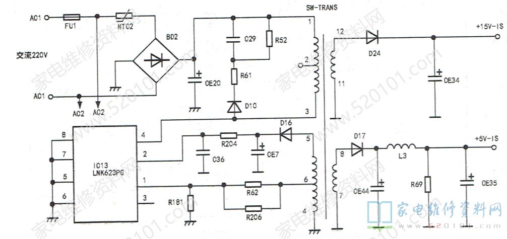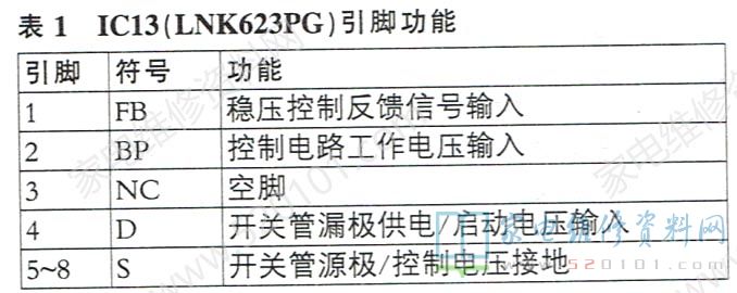 如图2所示,它是一个以电源芯片IC13(LNK623PG)为核心构成的变压器SW-TRANS耦合并联型开关电源电路,IC13各脚功能如表1所示。