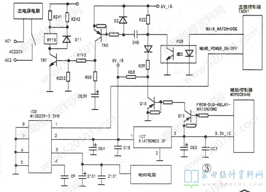 (2) 待机控制电路工作失常。 如3.3V-IS输出正常,而MC9S08A48无From-SUB-Relay-W atchdog控制信号(低电平)输出,应检查辅微处理器电路。若启动信号正常,则待机电路Q13、Q15、R39、D3、C45、TR5、RI93、TR7、RY15、R242存在开路故障,或C45.D2、CE3S、R2I2、D11存在短路故障。3RYIS不良。因打火、尘锈或积垢引起的电磁线圈开路,或常开触点接触不良。