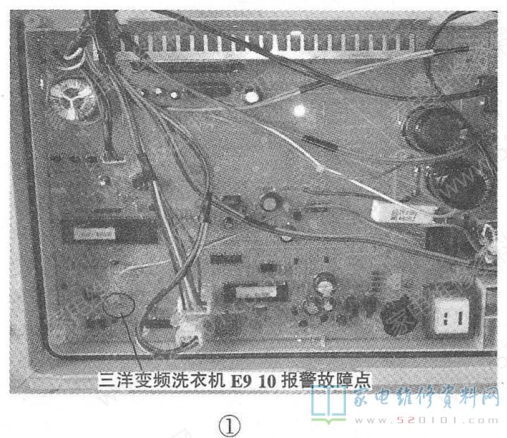 例1:一台三洋xQB65-B935YX型洗衣机,开机三秒左右显示屏显示E9 10故障代码,各个指示灯开始闪烁蜂鸣器发出报警声,整机不能进入任何洗衣状态。分析检修:拆机发现,该机是一台变频波轮洗衣机,面板上仅有触摸控制钮和显示功能,其他的微电脑控制电路都安装在洗衣机后背板的下部,整机控制电路很复杂。由于不了解E9 10故障代码的含义,整机又处于保护状态,看不到故障的真实状态,一时真不知道该如何进行检修。无奈之际,上网查询,看能不能找到故障代码的含义,通过搜索,不但找到了E9 10故障代码的含义,而且还知道了厂家的技改方案。资料上提示变频波轮洗衣机E9 10报警的原因是:电脑主控板中测试温度的二极管过于敏感,技改方案是取消二极管D307 (对于后期生产的洗衣机,厂家巳经取消了D307),如果这种控制电路还出现E9 10报警故障,则需继续拆除电阻R346。故障点参见图1。