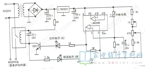 一台富茧牌2011-1型蚕用电子自动调温器,无论将电位器调到什么位置,均不能输出AC220V电压。实测该机电路如图1所示。运放LM358①脚(加热信号输出端)的电压由②、③脚电压决定,当②脚电压大于③脚电压时,①脚为低电平;反之,①脚为高电平。检测热敏电阻及470Ω温控电位器正常,但1k微调电阻接触不良。用电子清洁剂清洗该电阻后,上电试机,故障排除。