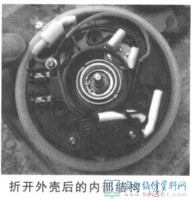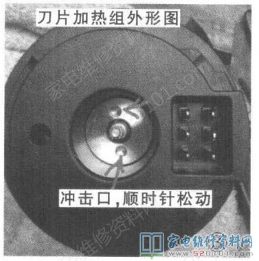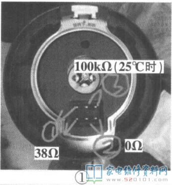 其检修过程如下:首先拆下加热刀片组件,然后检查位于加热盘组件上的温度传感器,如图1所示,标示“1”的两根线接发热盘,正常阻值为38欧;标示“2”的两根线为控制线,正常阻值为00;标示“3”的两根线接100K温度传感器。实际测量处阻值都正常,但“3”处阻值只有581了,据此判断温度传感器有问题。
