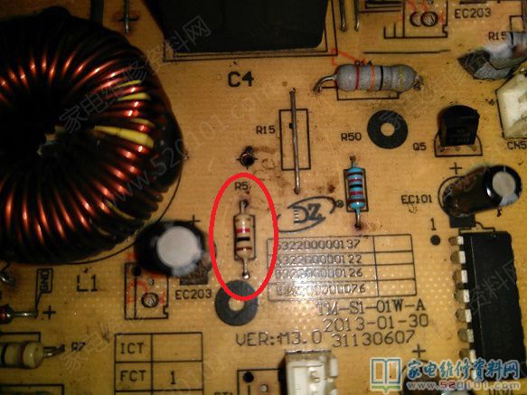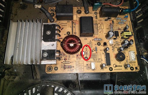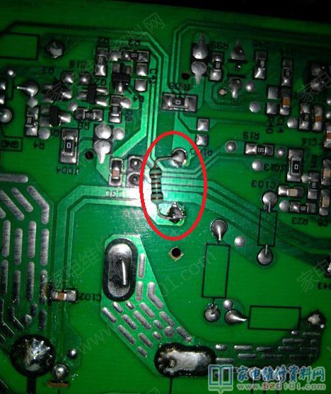 上面一直串联灯泡试机,去掉灯泡却是间断加热,测300V/18V/5V都正常,补焊康铜丝无效,接下来做了相当多的无用功,可调电阻500欧正常,与之串联的R5/1K阻值正常换无效,两个温控80多K,换0.3uF/0.5uF电容无效,查完所有插件电阻都基本正常,R16/820K实测768K,换无效,用其它美的5线板排除按键板问题后,继续查贴片,查C102/C16/C17实测为104,代换无效,把锅抬起来一些试,还是不行,差点放弃维修了,原机R5电阻换下来,想想没用了,没事就并上去原来位置看看,没想到有惊喜, 电磁炉没有间断加热了。