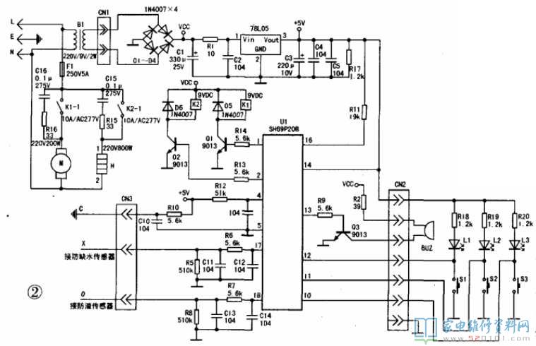 6.电动机控制电路由U1 内电路经①脚与R14、Q1、K1、D5,以及220V 市电侧消弧抗干扰的R16、 C16 和电动机等组成。