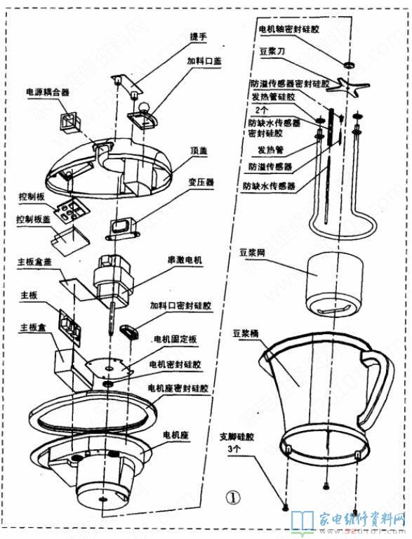 1.结构该机分解示意见图1。这是一款典型的电动机及发热管内置式豆浆机。这种结构的豆浆机所占的比例最大。