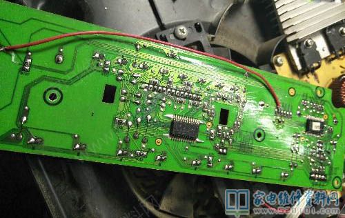 拆机有灰尘,吹干,拆掉保温弹片,试机故障不变。测三电压正常,18v稳压管正常,该补焊的补焊。再试还是一样。转到控制板上,板子很新,电压正常,无腐蚀,无氧化,测铜铂线路各路通,无漏电。发光二极管正常。这就奇了怪了。直接一刀割开CPU连接保温按键。试机功能正常。随后又焊接试了试,就是这跟导线惹得鬼,随机飞线一根。所有功能正常。下面付图。从图可看主板绝缘漆无脱落。测试各铜箔无漏电。