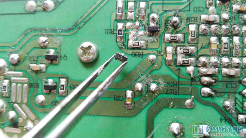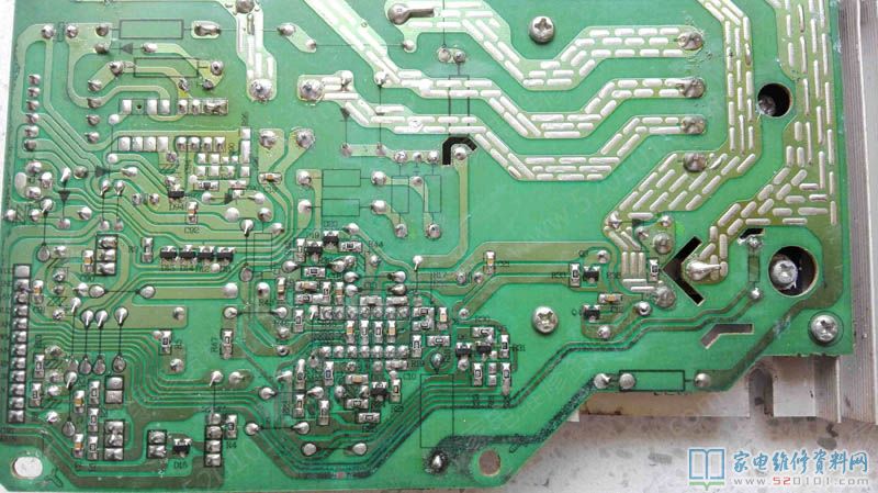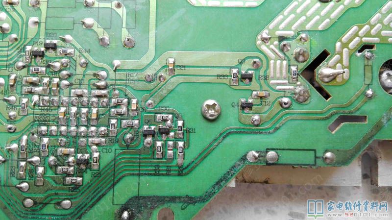 电路板正面基本检查完了,说明同步电路、电压检测电路、过热保护电路等都没问题。CPU也换了,也没问题,那问题就可能出在驱动电路上。这个板子驱动电路都在电路板背面,都是些贴片元件,所以开始都不想查这些。