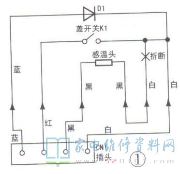 断裂的白线一端与感温头相连。 将万用表置R x 1k挡,在路测量插头CN1中蓝线与白线的阻值:当黑笔接蓝线,红笔接白线时,阻值为7k;交换表笔,阻值为22k.,由此判断D1及其连线正常。为便于焊接断点,找来长嘴电烙铁和一段软导线,并在软导线外套上绝缘管,然后将软导线两端与断点焊接,最后移动绝缘管使之罩住焊接点,并涂上704胶防水,如图2所示。装机上电,故障排除。