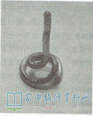 观察该燃气灶;发现更换热电偶比较麻烦,加上急用,决定先做个应急处理。找一段长约10cm且玉铅笔芯粗细相近的铜丝(若用电机中的铜丝,须先用砂纸磨掉铜丝上的绝缘漆),绕成图2所示的形状,并剪掉多余铜丝,然后用镊子将铜丝大圈套在热电偶的瓷柱上,小圈卡在瓷柱上的金属断头上,如图3所示,最后用尖嘴钳稍微夹紧,不可太大力,只要小铜圈与金属断头接触良好即可。按此方法处理后长时间试机,一切正常。