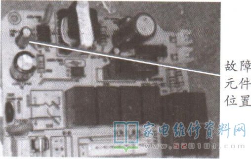 断电后测量7805的输入、输出对地电阻,没有发现短路现象。拆下7805后上电,测得7805的输入端焊盘对地电压为9.6V,而正常值应约为11V,由此判断7805的供电输入电路有问题。经查,电容E2( 10uF /25V )漏液。换新E2后上电,7805输入电压为11.7V, 输出电压为5V,均正常。装机试机,故障排除。