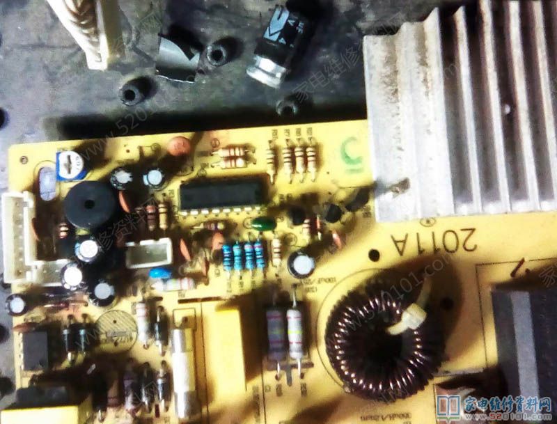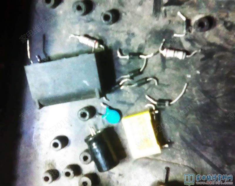 测量之后有一个二极管坏,有一个限流电阻红橙黑金黑坏(应该是23欧吧,找不到计算器),有EE16坏,蓝色部分器件纯粹全部换掉。上电无5V,278V正常,4.7uF处无电压,18V无,仔细一看,有一颗二极管装反了,调正之后,开机有滴声,实际测量只有4.88V;17.60V,278V,风扇处12.7V,看78L05处,输入8.76V,输出4.88V;换78L05;加热正常,电流表7.6A,维修结束。
