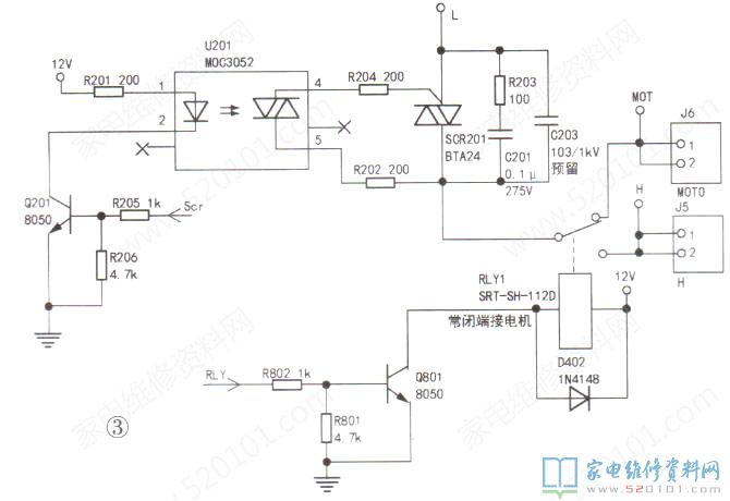 分析检修:此故障通常系电机(或继电器RIY1)损坏所致。该机的电机受可控硅SCR201(BTA24)及继电器RLY1控制,如图3所示。如果电机长时间运转,电机容易过热损坏,并连带损坏sCR201。按照厂家要求,破壁机连续工作时间不能超过2分钟。故障现象5:触摸屏失灵。分析检修:首先检测U1(78L05 )输出的5V电压是否正常,如果正常,则问题出在控制板上;如果不正常,则检查电源电路。接下来检查发光二极管、显示屏是否正常,如果正常,则更换控制板。