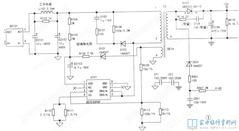 分析检修:首先检查搅拌桶盖子是否合好,然后取下玻璃搅拌桶,用小改锥按压安全开关,如果机器恢复正常,则说明故障原因是盖子没有盖好,或者安全开关触发杆断了;如果仍不通电,则说明主机有问题,需要拆机检查。拆机时,先取下电机连接器上的橡胶减震圈,再拧下减震圈下面的一颗反丝口螺丝,取下连接器。然后拆下黑色密封橡胶盒,拧下盒上的4颗螺丝,可看到电源板和控制板。该机电源板是灌胶板,电源芯片采用OB2530PAP(U101),如图1所示。上电后首先要测量二极管D103的负极电压是否为12V,如果是,则问题出在控制板上;如果不是,则问题出在电源板上。该电源板上二极管D103(HER202 )击穿、电阻R104及R105开路.U101不良较为常见。