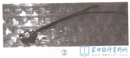 分析检修:首先检查机器底座和玻璃桶之间的连接插座有无进水痕迹,插孔内的金属片是否变形,如果上述检查都正常,则故障原因多为玻璃桶内的温度传感器失效。该温度传感器外形如图2所示,正常温度下的阻值为100k2。另外,如果该传感器性能不良,还会导致溢浆现象。