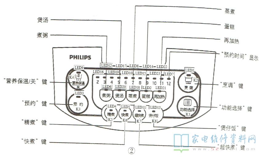 (1)若底盘热敏电阻开路, 则上电后蜂鸣器鸣响,且LED4、LED5、LED11和LED15闪亮,即面板上的“煮粥”、“快煮”、“超快煮"和“煲仔饭"指示灯闪烁。