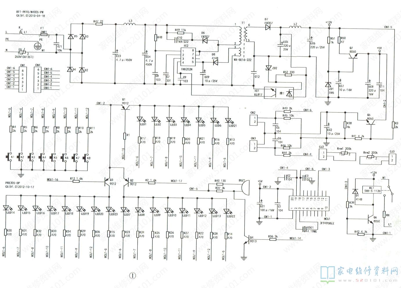 故障现象2:在煮饭过程中,当盖顶有蒸汽冒出时,机内蜂鸣器鸣叫,且“预约时间"②~⑥灯闪烁。有时拔下插头后,开盖再关上或降温几分钟后,再上电,电饭煲又能工作,但仍会重复出现上述故障现象。分析检修:该机有两块电路板:一块是CPU板(型号:PRE305-DP),含键盘和LED显示;另一块是电源板(型 号:BT1-PFFE/N4005-PW),含发热盘控制、锅顶和锅底温度采集。从故障现象看,电源应该正常,怀疑是单片机控制电路有问题。笔者实绘出该机电路如图1所示。