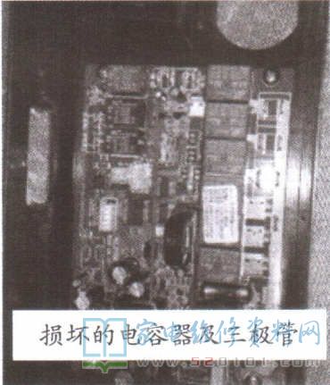 接修一台高科D900L12-ZK集成灶,故障表现为上部控制面板不亮,但下部的灯板工作正常。打开集成灶的上盖,发现电源板上12V电压滤波电容鼓顶,该电容旁边的一只三极管炸裂,如图1所示。更换电容与三极管后试机,故障排除。