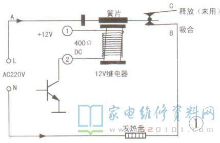 当继电器线圈得到12V供电时,继电器吸合,A.B触点闭合,发热盘得电发热。上电测得继电器线圈两端电压为12V,且A端有AC220V电压,但B端无AC220V,判断继电器触点烧坏。换上同规格继电器后试机,故障排除。此时测得工作电流约为4A。近期已维修了几胎该型电饭煲,故障现象均为不加热,故障原因均是继电器触点烧坏,看来该型电饭煲原用继电器质量欠佳。