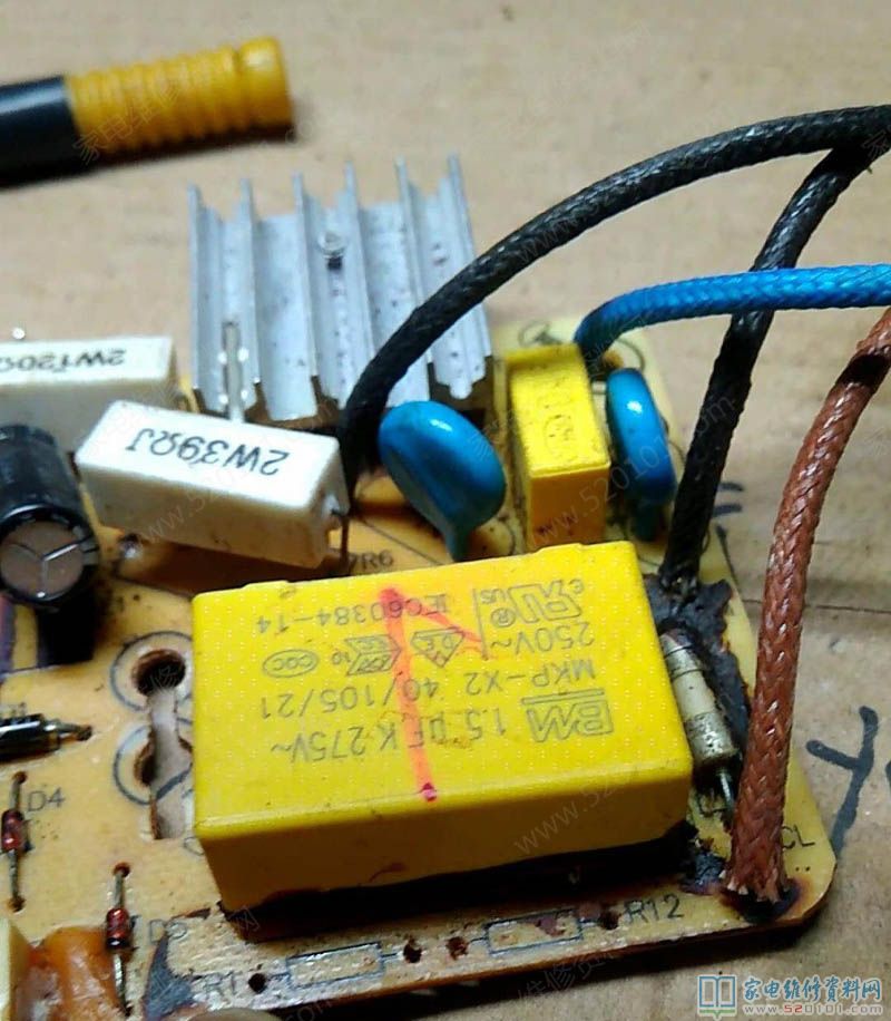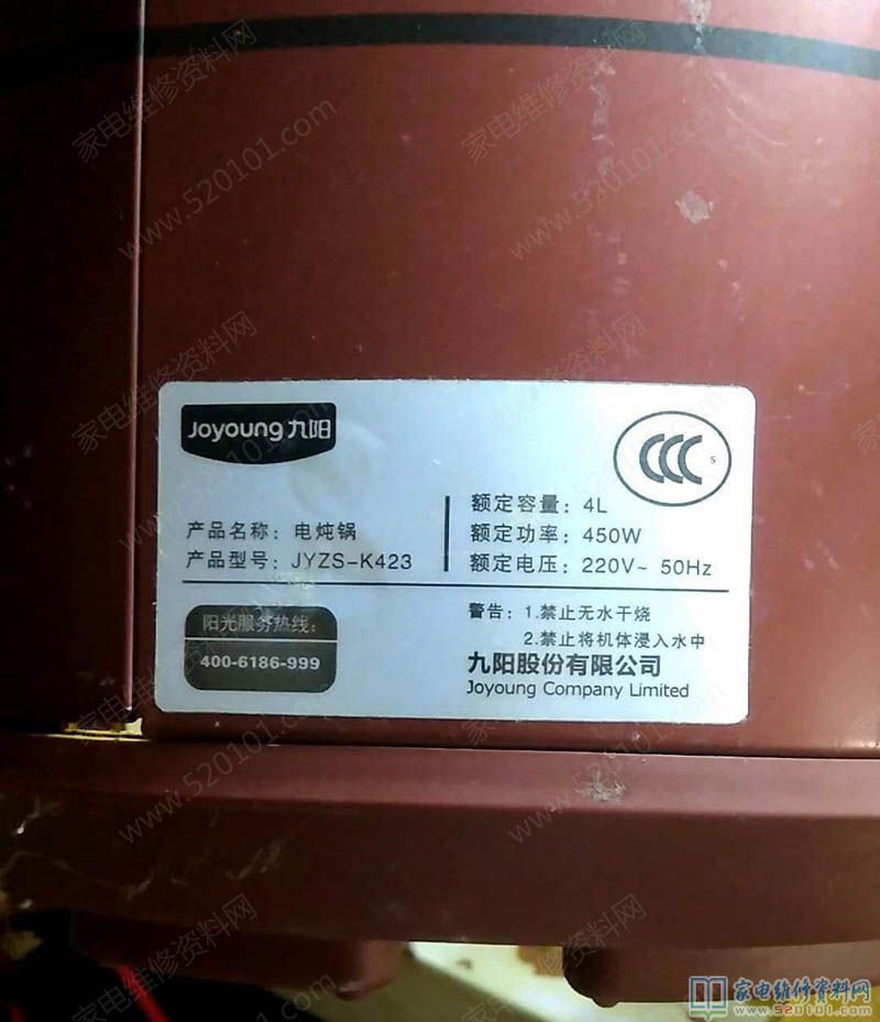 接修一台九阳JYZS-K423电炖炉,客户说是不加热,而且显示E4代码,拆开电源板,上网一查,说是电流不稳低造成,可能是R1、R2、R3有问题,赶紧测量,都没有问题,最后索性全部电阻都测一遍,最后发现是R12电阻330K的开路无穷大,立刻换上,故障修复。