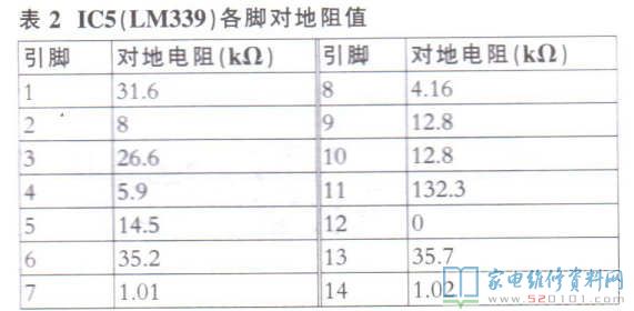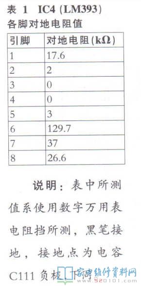 常见原因系康铜丝脱焊,可调电阻VR接触不良,IC4(LM393 )损坏(正常对地阻值见表1)。