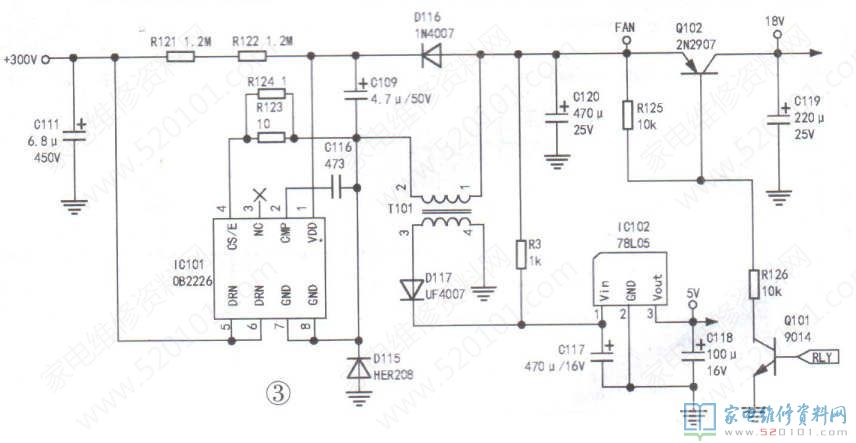 和一般机器不同的是,该开关电源输出的18V供电受Q102控制。只有控制板发出开机信号,Q102才会输出18V。首先测量电容C111(6.8uF/450V )两端电压,正常值为280V~300V。如果此处电压异常,则检查市电整流滤波电路;如果电压正常,则检查IC102(78L05)①脚电压输入。如果IC102输入电压为0V,则重点检查R121.R122.T101 IC101.D115、c109。如果IC102输出5V正常,则检查控制板。