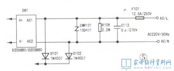分析检修:首先检测IGBT管,如果正常,则重点检查市电输入及整流电路中的DB1.D101、D102、ZMR101.C112等元件,如图5所示。