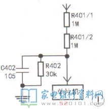 分析检修:此故障的原因多为市电电压检测异常,重点检查市电电压取样电路,如图1所示。取样电压来自于整流二极管D101.D102,经RA01/1R401/1.R401/2和R402分门R401/2压后,送给单片机。实修发现,R401/1和R401/2损坏0402-上门R402105宁30k率较高,建议换用1M/1W高精度电阻。