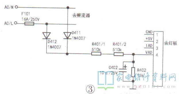 接修一台苏泊尔C21-SDHC04型电磁炉,开机后面板上的数码管显示“E4”,不加热。查询资料,故障代码“E4"表示欠压保护。拆机检查,该机主板号为C21- SDHJ06-S-DL02-A0,其电压采样电路由D411.D412.R401等元件组成,如图所示。经查,电阻R401/2已开路。更换R401/2后试机,故障排除。