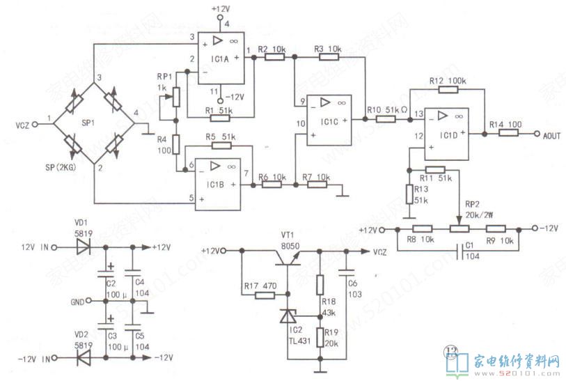 +12V电压经过VD1.VD2单向导通保护和C2~C5滤波后,获得+12V和-12V直流电压输出。调整管VT1和IC2(TL431)等元件组成串联稳压电路,输出二次稳定电压vcz(约10V),用作基准调节电压,供给压力传感模拟放大电路以ICI(LM324)为核心组成,IC1A和IC1B组成了平衡对称双输入、双输出的差动放大电路,ICIC对差动放大电路的输出信号进行放大,并送给ICID再次进行放大。RP1的作用是对IC1A.IC1B的增益进行调整,使之相同。电阻R1.R5分别是IC1A.IC1B的反馈电阻,电阻R3.R12分别是IC1C.IC1D的反馈电阻。在压力传感器未受到压力时,IC1A、IC1B③、⑤脚的输入信号电压均为0V,此时ICID②脚电压应为0V。为此,ICID②脚外接零电位电路。R8、RP2.R9串联,两端分别接+12V和一12V电压,调整电位器RP2使①脚的静态电压为0V。-旦RP2连入电路的阻值确定,就不能改变,否则就会出现称量不准的现象。