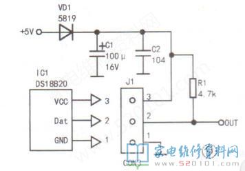 IC1②脚(需外接.上拉电阻)为数据输入或辅出端,与单片机相连,单片机根据协议读取温度娄据。须注意的是,与IC1②脚相连的后级电路应采用OC (集电极开路)或OD(漏极开路)结构,否则易烧坏IC1。