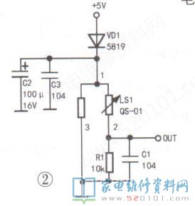 QS-01型气敏管内置加热器及金属氧.化物半导体,其工作电压为4.5V~5.5V,对各种空气污染源有很高的灵敏度,并且响应时间很快功耗极低,输出特性较好,仅用简单的电路,就可以将污染物气体浓度转换成对应的电信号输出,其典型应用电路如图2所示。在空气质量较好时,OUT端电压约为3.9V;当空气中杂质浓度较高时,传感器LS1的阻值减少,OUT端电压升高。