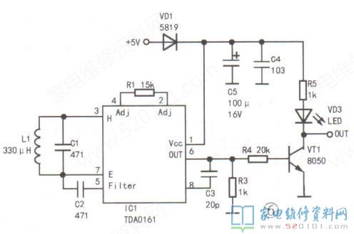 当无金属物体接近电感L1时,电感L1与电容C1并联高频谐振,IC1⑥脚输出低电平,三极管VT1截止,OUT端输出高电平(约3.1V),指示灯VD3不亮。当有金属物体接近L1时,因金属内部产生高频涡流,吸收振荡器能量,从而造成谐振停振,这时IC1⑥脚输出为高电平,VT1导通,OUT端输出低电平(约oV),VD3亮。