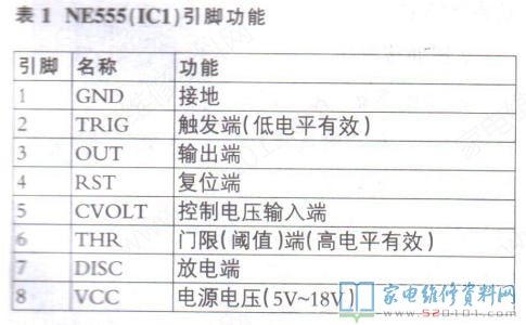 IC1(NE555)、话筒MIC、光敏电阻MG-52B与三极管VT1.VT2等元件组成单稳态触发器,VT3为反相输出电路。IC1是一块应用非常广泛的时基集成块,其引脚功能见表1。