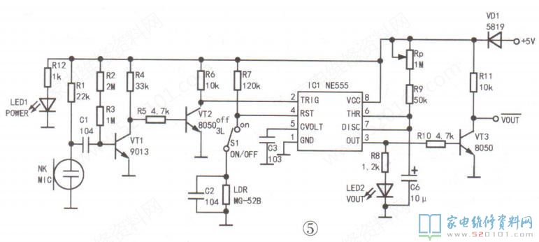 S1为光控开关,当S1断开时,光敏电阻LDR(MG -52B )未连入电路,IC1的④脚为高电平,以IC1为中心组成的单稳态触发器正常工作。当没声音信号时,VT1导通,其集电极为低电平,VT2截止,IC1②脚为高电平,IC1③脚输出低电平,VT3截止,信号输出端(OuT)为高电平(约4.4V)。当有声音信号时,低电平信号耦合到VT1的基极.VT1截止,其集电极输出高电平,VT2导通,IC1②脚获得低电平触发信号,③脚输出高电平,信号指示灯LED2亮,OUT端为低电平(约0V)。一段时间后,单稳态触发器又回到未触发状态。调节Rp,可调节触发时间长短。闭合开关S1后,光敏电阻接入电路工作。当光敏电阻受到强光照射时,光敏电阻阻值变小,IC1④脚变为低电平,IC1停止工作,VOUT端输出高电平。当无光照射光敏电阻时,光敏电阻阻值很大,IC1④脚为高电平,IC1正常工作,其工作过程与上述S1断开时的工作过程相同。