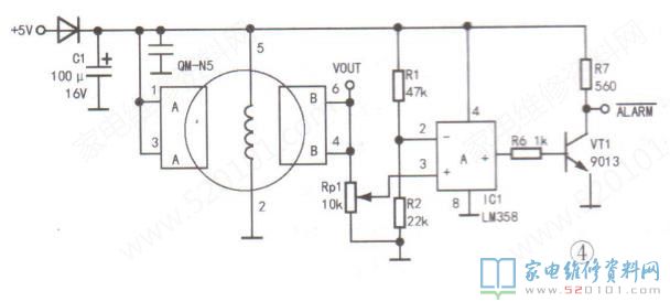 在无烟环境下,QM-N5型气敏管两输出端间的阻值为数+千欧姆;在有烟雾环境下,其阻值会降到数千欧姆。QM-N5型气敏管和电压比较器IC1(LM358 )组成烟雾传感器电路,供电为4.5V~5.5V,如图4所示。