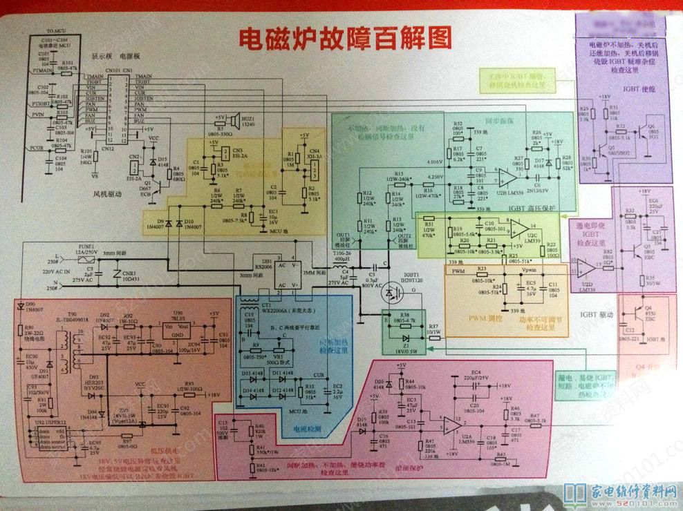 下图是本人收藏的一款电磁炉各个模块电路介绍和故障点分析的图片,仅供新手维修电磁炉入门学习使用。