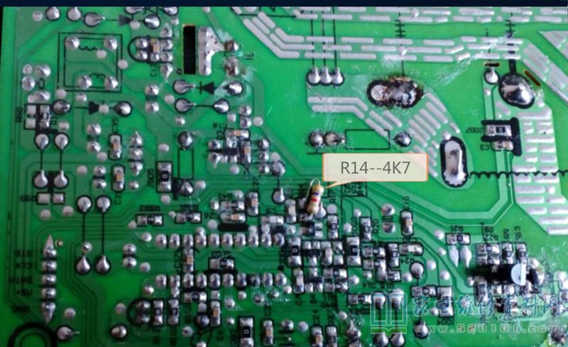 网上查看相关维修资料,拆机查各大电阻、电容,各点电压及S007电压没发现异常,在线查全板电阻,测得S007第20脚外一电阻R14阻值4.3K(正常4.7K)开始觉得在线测这点差异不太可能有问题,可全测了就这一个差异大一点。就抱着试下的心态,更换试下,装好试机可以了,换下的贴片测得阻值为4.5K。