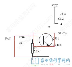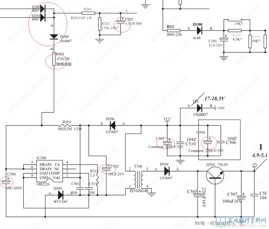 接修一台九阳C21-SC012电磁炉,故障表现为开机一会就自动待机,拔下风扇后工作正常,无锅时检测风扇电压13V,检查SS8050、R509、R510都正常,检查绕线电阻R503和二极管D200和D201以及C202电容也是正常的,如下图所示,最后怀疑是OB2226的问题,网购了OB2226换上去之后故障修复。