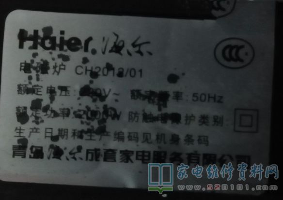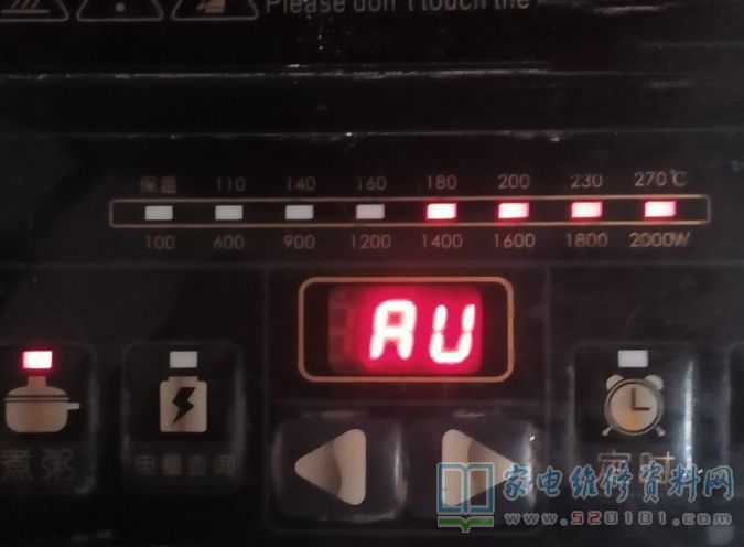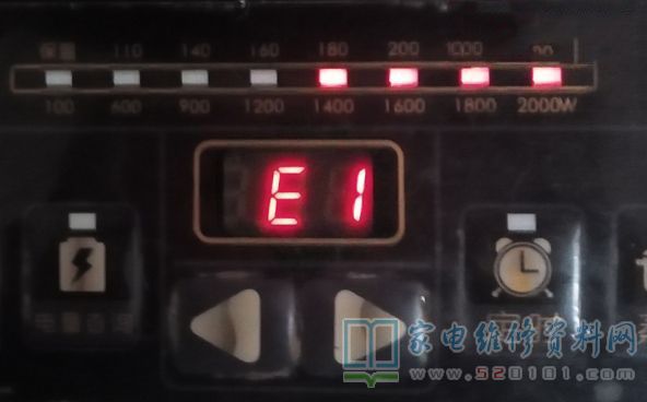 接修一台海尔CH2012/01电磁炉,客户反应面板坏,接手后确认面板是坏了,面板修好后,不放锅时,只显示E1,放上锅发现加热时断时续出现AV或E1(显示AU时在加热,E1不加热)如下图所示,网上查海尔此款电磁炉故障代码E1为没放锅具或锅具材质不符,但换几个锅试结果都一样,检测电磁炉18V、8V、5V电压都正常,大电阻也有拆下测试电阻值正常,0.33uF、5uF、2uF电容均正常,功率管下热敏电阻常温测试20K,加热阻值不断变小。最后发现是可调电阻坏了,更换后故障修复。
