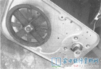 接修一台东菱DL-100面包机,通电试机,按键、显示均正常,但和面时搅拌叶片不动,电机发出“嗡嗡”声。首先拆开上盖,取下金属框(此机外壳底部没有可拆螺丝),然后拆下按键操作板,左旋内胆桶,取下内胆,拆下内胆下方4颗螺丝发现,电机皮带已老化碎掉,如图所示。更换皮带后试机,故障排除。